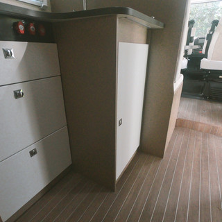 Dahinter ist die Küchenzeile mit einem Gasherd (3 Kochstellen) und Spüle angesiedelt. Darüber und darunter befinden sich zahlreiche Schränke und Schubladen für genügend Stauraum, die alle mit Dämpfern ausgestattet sind. Auf der linken Seite befindet sich eine große Kühl/Gefrierkombi, die sowohl mit Batterie als auch mit Gas betrieben werden kann. Sehr praktisch, wenn man mal irgendwo ohne Strom steht und trotzdem ein kühles Bierchen haben möchte..:-).