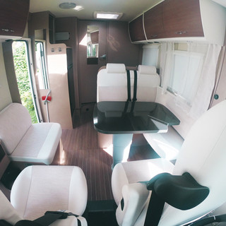 In der Mitte des Wohnmobils befindet sich die gemütliche Sitzecke mit Tisch. Durch Umdrehen der Vordersitze haben 5 Personen sehr locker Platz. Der Tisch ist individuell verstellbar.