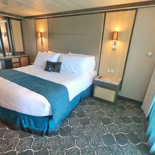 Nach einer kurzen Einweisung des Personals und Orientierung fahren wir über einen der insgesamt 24 gläsernen Aufzüge in unser Deck 12. Wir haben ein 16 m2 großen "Ocean View Stateroom with Balcony" für bis zu 3 Gäste. Neben einem Doppelbett gibt es ein Sitzbereich mit Sofa, ein vollwertiges Badezimmer und einen privaten Balkon mit Meerblick. Was will man mehr..;-). Wer natürlich mehr will, der kann sich in verschiedenste Suiten bis zu einer Größe von ca. 120 m2 einquartieren. Besonderes Highlight auf der Symphony of the Seas ist die zweistöckige Family Suite mit fast 130 m2 die wahrscheinlich jedes Kinderherz höher schlagen lässt.